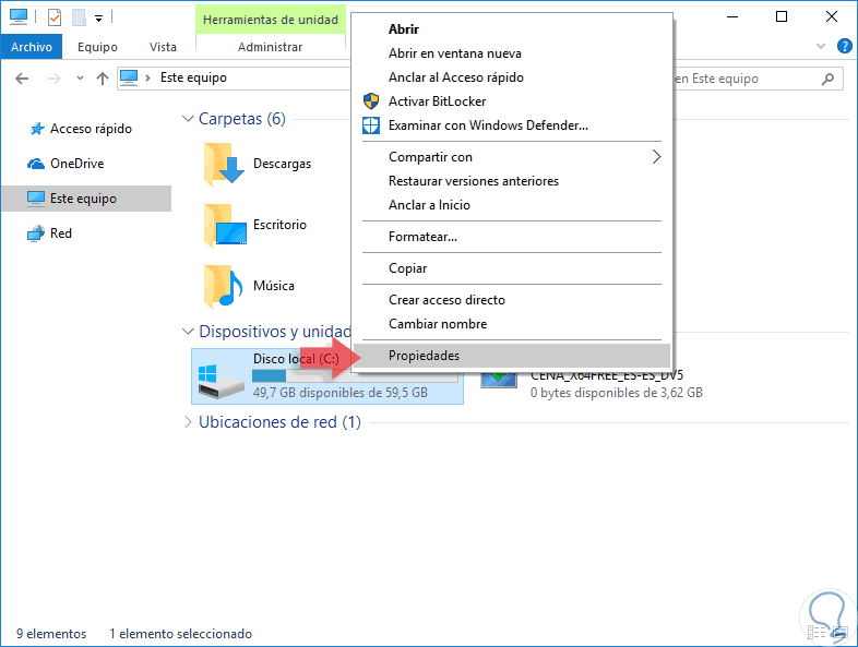Para iniciar el proceso de creación de cuota de disco duro en Windows 10 abrimos el explorador de Windows y damos clic derecho sobre la unidad a gestionar y en la lista desplegada seleccionamos la opción Propiedades.