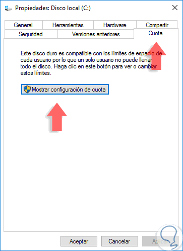 En la ventana desplegada vamos a la pestaña Cuota. Daremos clic sobre la opción Mostrar configuración de cuota y veremos lo siguiente: