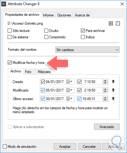 Para ejecutar Attribute Changer debemos ir al archivo a editar, dar clic derecho sobre él y seleccionar la opción Cambiar atributos. Veremos lo siguiente. Allí debemos activar la casilla Modificar fecha y hora para que sea posible realizar los respectivos cambios en el archivo