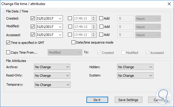 Basta con activar las casillas del atributo que deseamos editar y establecer el nuevo dato. Finalmente pulsar sobre la opción Do it y luego en Save Settings para guardar los cambios. De esta forma podemos usar BulkFileChanger para la respectiva edición de los atributos en Windows 10.