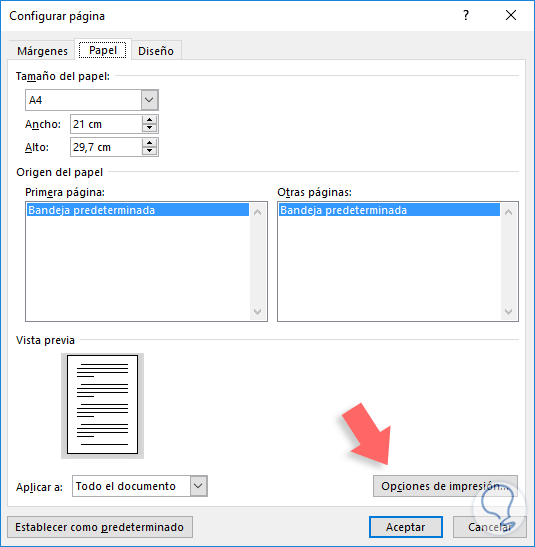 Se desplegará el siguiente asistente donde vamos a la pestaña “Papel” y seleccionamos la ficha “Opciones de impresión”.