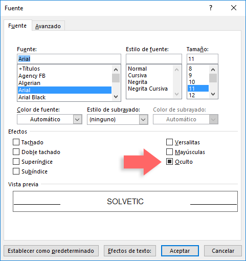 Veremos la siguiente ventana. Allí activaremos la casilla “Oculto” ubicada bajo el campo “Efectos”. Pulsamos en el botón “Aceptar” para guardar los cambios.