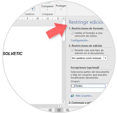 Seleccionamos la opción “Restringir edición” y seleccionamos las opciones requeridas del costado derecho