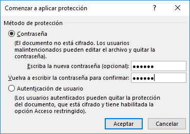 Una vez definidos pulsamos en la opción “Si, aplicar la protección” desplegando un poco más abajo las opciones. Allí estableceremos la contraseña con la cual se contará con los permisos para editar dicho archivo.