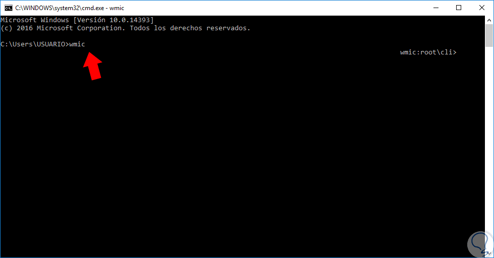Para acceder a WMIC tenemos que abrir la Consola de comandos según los métodos que conocemos. Al abrir el Símbolo del sistema ingresaremos el término wmic, pulsamos Enter.