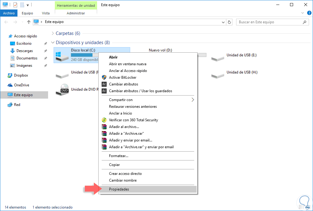 Para usar CHKDSK debemos dar clic derecho el disco duro a analizar y seleccionar la opción Propiedades.