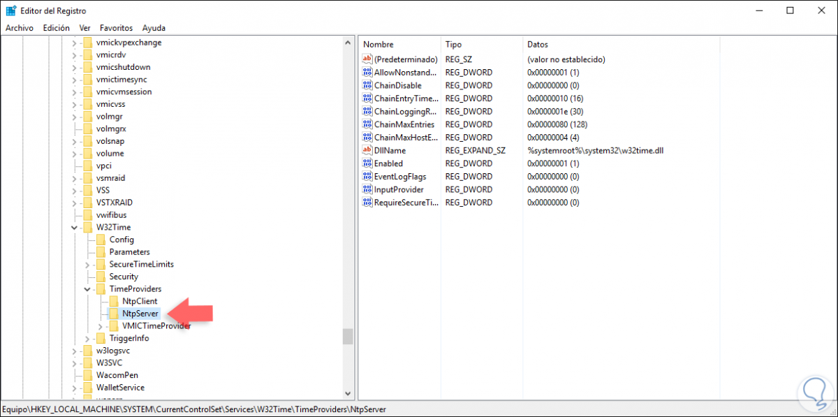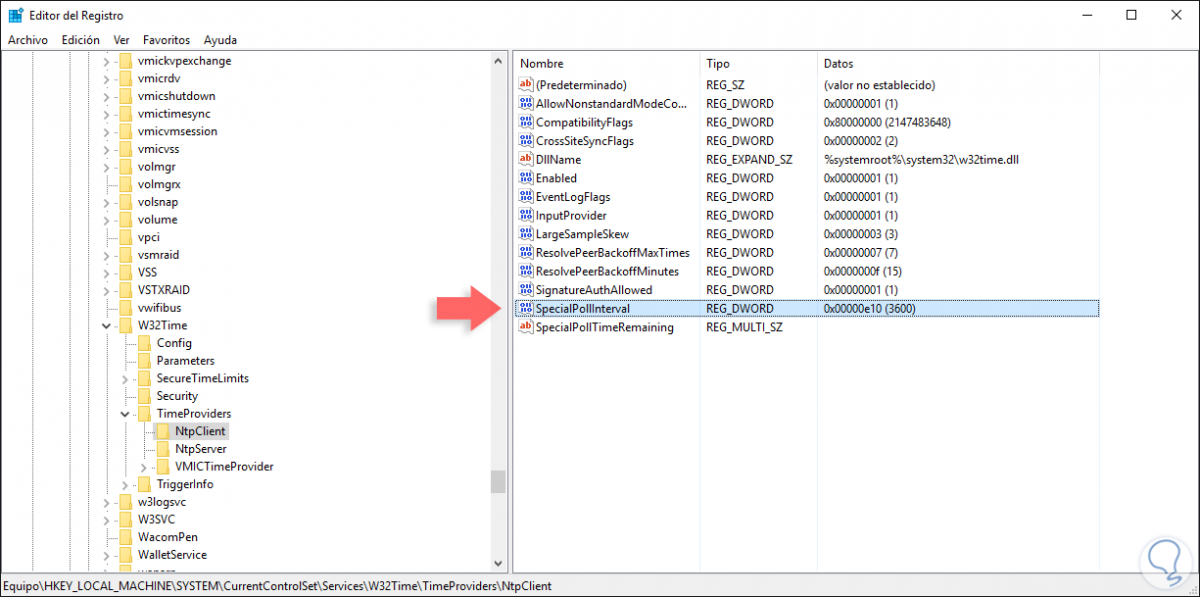 Ahora vamos a la subclave NtpClient y nos fijaremos en el registro llamado SpecialPoolInterval
