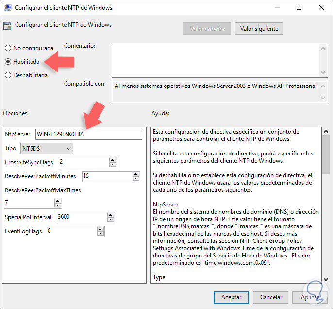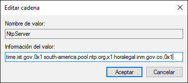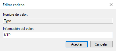 En este caso estableceremos su valor en NTP. Pulsamos Aceptar para guardar los cambios.
