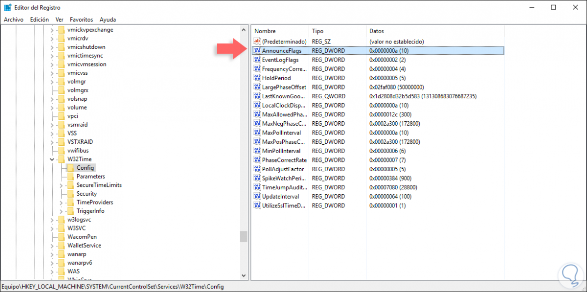 Podemos ver que W32Time está compuesta por diversas claves. En primer lugar accedemos a clave Config y seleccionamos el registro AnnounceFlags ubicado en el costado derecho.