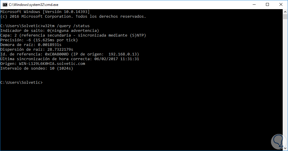 Ahora abrimos una consola de símbolo de sistema en el equipo cliente y ejecutaremos el comando siguiente para comprobar el estado de sincronización del equipo cliente: