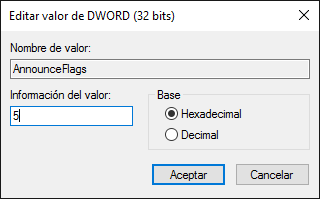 Este valor hace referencia a que el controlador de dominio se actualizará con una fuente externa, pulsamos en Aceptar para guardar los cambios. El siguiente registro a modificar es el registro Type ubicado en la clave Parameters
