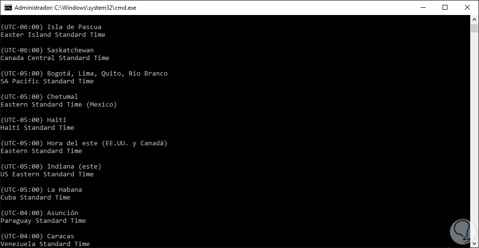 Allí se desplegarán todas las zonas horarias disponibles. Este archivo debe ser guardado con la extensión .bat para su ejecución.