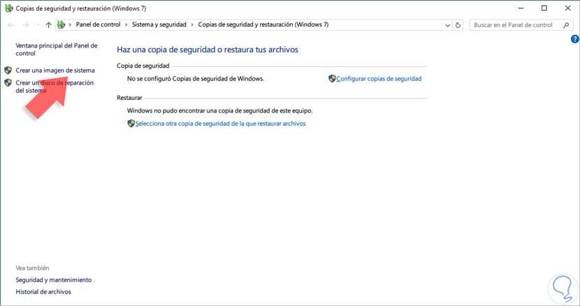 En esta ventana pulsaremos en la opción izquierda de “Crear una imagen de sistema”.