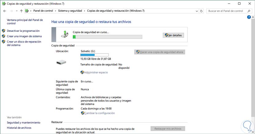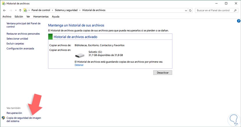 Como ya hemos activado esta opción ahora podremos pulsar en la opción inferior de “Copia de seguridad de imagen de sistema”.