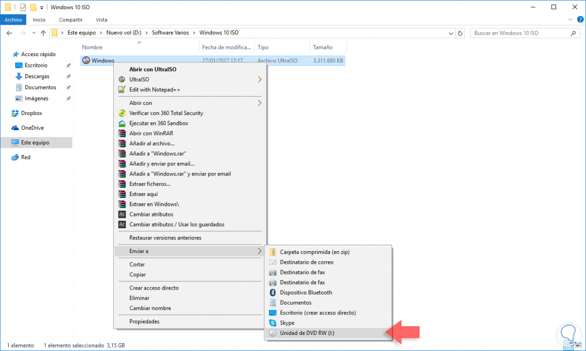 En primer lugar, debemos introducir un disco en blanco en la respectiva unidad lectora y una vez realizado este proceso vamos a la ubicación de la imagen ISO a grabar, damos clic derecho sobre ella y seleccionamos la opción Enviar a / Unidad de DVD RW