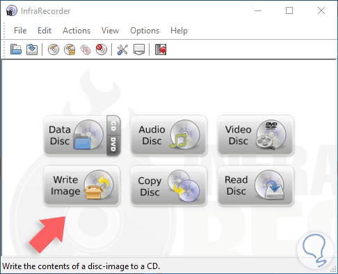 Allí seleccionamos la opción Write Image para iniciar el proceso de grabación de nuestra imagen ISO: