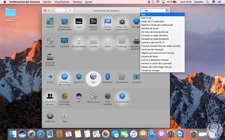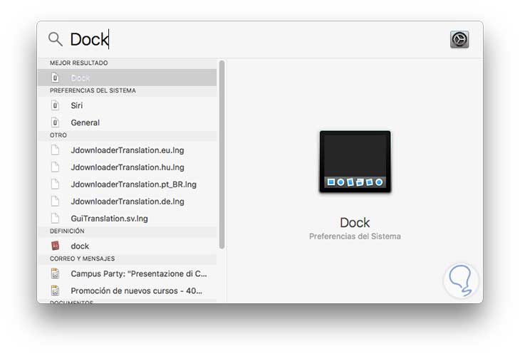 Sabemos que Spotlight es una utilidad muy práctica que nos brinda la posibilidad de obtener resultados inmediatos sobre el valor buscado y Preferencias del sistema no puede quedarse por fuera de esta búsqueda. Para esto ingresamos el valor buscado en el menú de Spotlight (icono de lupa ubicado en la esquina superior derecha) y seleccionar la opción que está de acuerdo a nuestra necesidad: