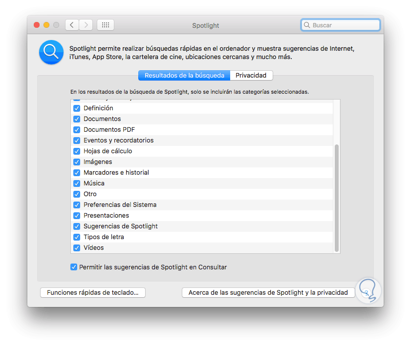 Puede suceder que la búsqueda que estamos realizando no nos arroje ningún resultado y la causa es que la opción de Preferencias del sistema no está activa dentro de los resultados de búsqueda de Spotlight. Para esto accedemos a la opción Spotlight en Preferencias del sistema y allí en la pestaña Resultados de la búsqueda debemos confirmar que la casilla Preferencias del sistema se encuentre activa.