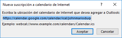 Se desplegará la siguiente ventana donde ingresamos la dirección ICAL. Pulsamos Aceptar y de este modo hemos agregado el calendario de Google en Outlook 2016