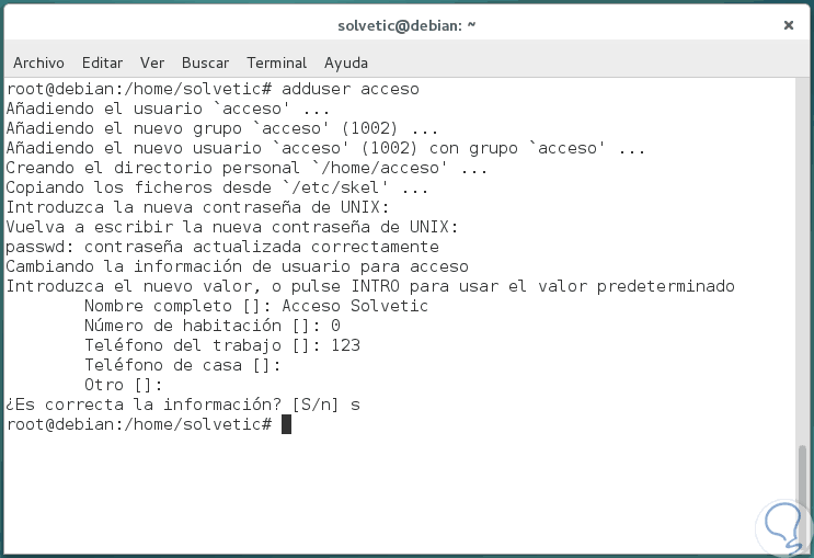 • Si estamos como usuarios root ingresaremos el comando adduser acceso.