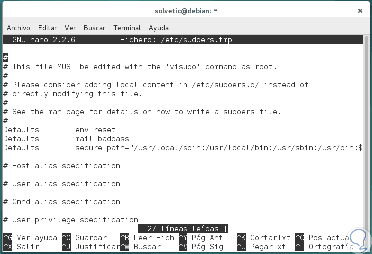 Es importante tener cuidado con la forma como gestionamos el archivo /etc/sudoers. Al ejecutar visudo tendremos la siguiente ventana: