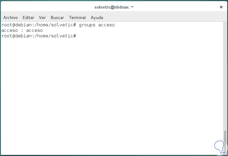 Para validar el nuevo grupo usaremos de nuevo la opción groups acceso y veremos el nuevo grupo adicionado en el perfil del usuario. De esta forma el nuevo usuario contará con privilegios administrativos y al próximo inicio de sesión podrá ejecutar comandos de forma normal usando la sintaxis ls ~.