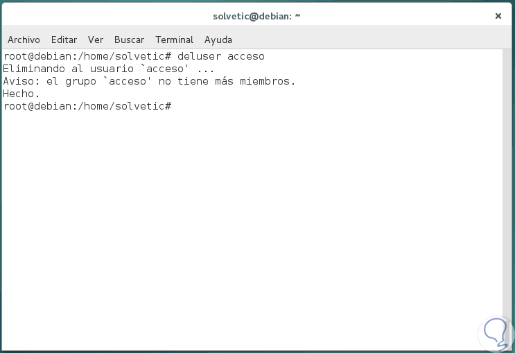 • Si no estamos como usuarios root ingresaremos sudo deluser acceso.