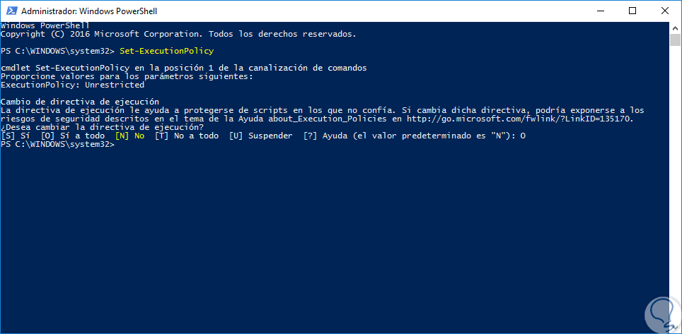 Ingresamos el valor deseado en el campo ExecutionPolicy y pulsamos Enter. En este caso hemos establecido la política Unrestricted ya que solo nosotros usamos el equipo.