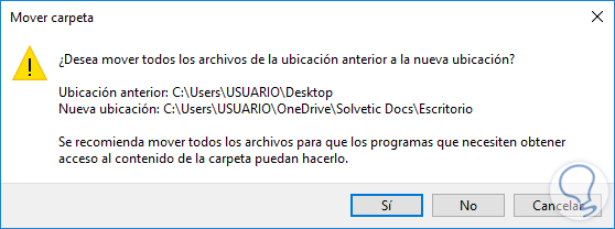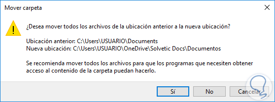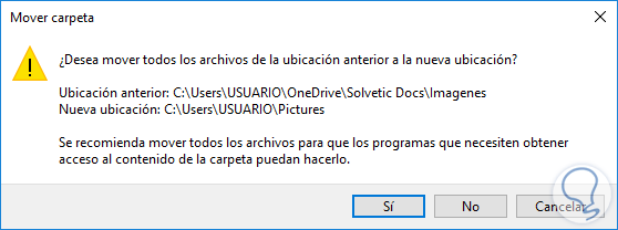 Pulsamos en Si y de este modo hemos restablecido nuevamente la carpeta a su ubicación por defecto en Windows 10.