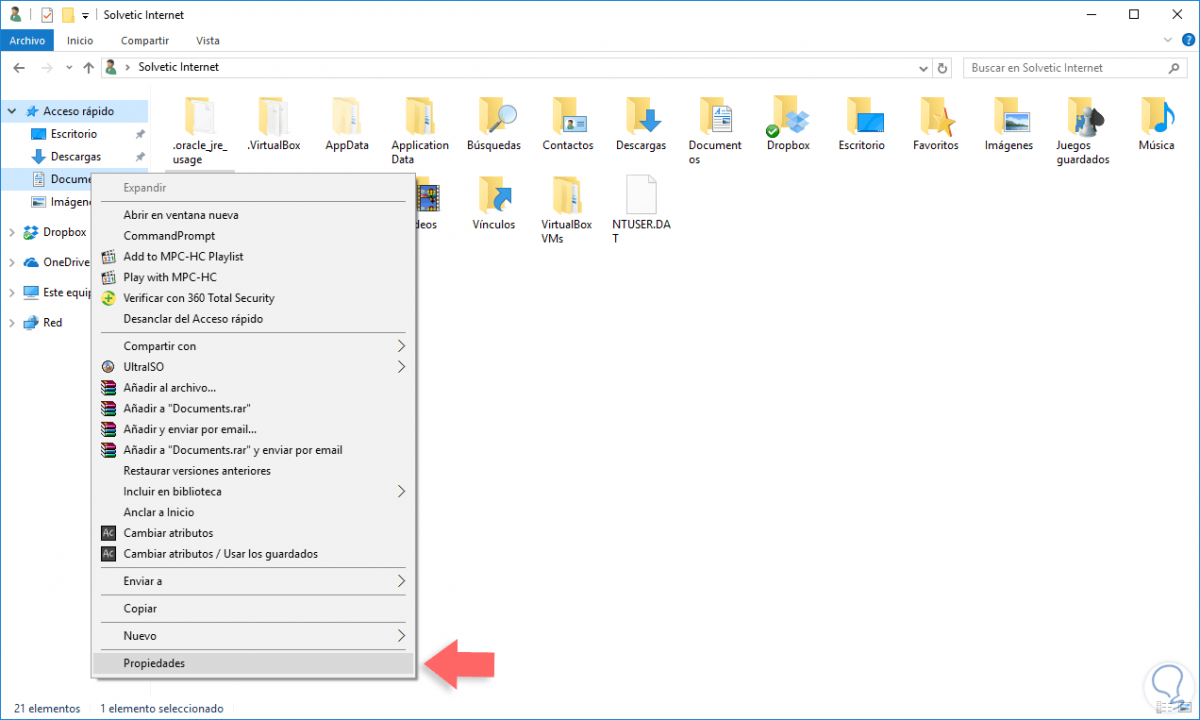Volvemos a la ventana principal y daremos clic derecho sobre la carpeta determinada Documentos y seleccionamos la opción Propiedades.