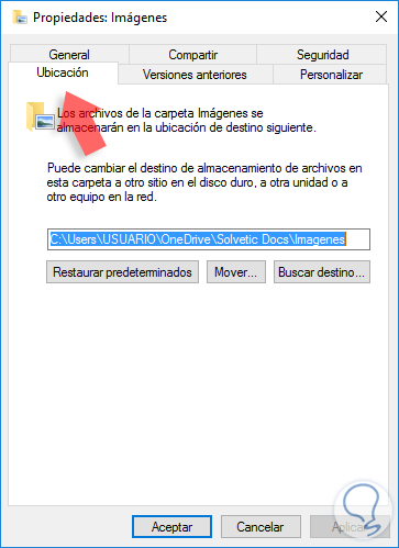 Si en algún momento deseamos que la ubicación este establecida de forma original debemos ir nuevamente a la carpeta OneDrive en la ruta C:\Users\USUARIO\OneDrive\Nombre_Carpeta. Allí daremos clic derecho sobre la carpeta a restablecer y seleccionamos la opción Propiedades y vamos a la ficha Ubicación