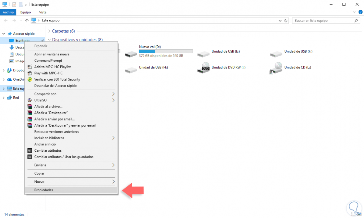 El procedimiento es similar al explicado anteriormente. Para esto abrimos un explorador de archivos y damos clic derecho sobre la opción Escritorio y seleccionamos la opción Propiedades