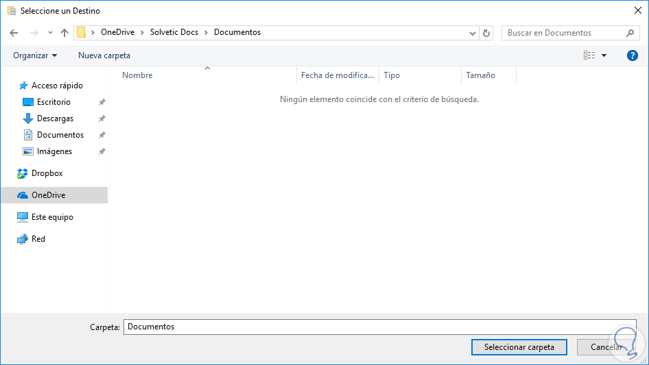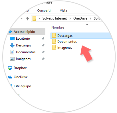 Allí abrimos la carpeta llamada OneDrive y crearemos una nueva carpeta que identifique nuestros archivos, la llamaremos Solvetic Docs, y dentro de esta crearemos las carpetas que identifiquen cada una de las carpetas a las cuales haremos respaldo en OneDrive, por ejemplo, Documentos, Imágenes, etc.