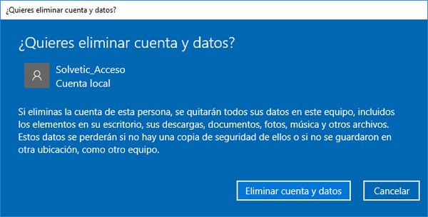 Seleccionamos la opción Eliminar cuenta y datos, de este modo hemos eliminado la cuenta del sistema operativo Windows 10.