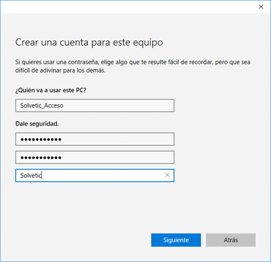 Microsoft nos ofrece la posibilidad de crear una nueva cuenta de correo electrónico para iniciar sesión desde ella, como no es el caso, pulsamos en la opción Agregar un usuario sin cuenta Microsoft y será abierta la siguiente ventana donde debemos ingresar el nombre y contraseña de acceso del nuevo usuario.