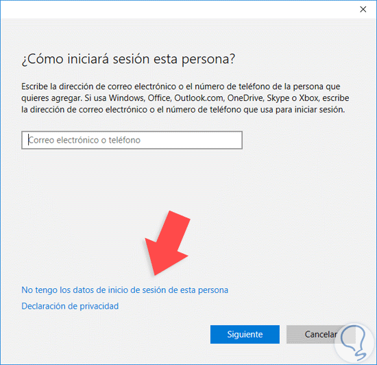 Vemos que por defecto Windows 10 intentará crear la configuración de la nueva cuenta para que inicie sesión usando la cuenta de Microsoft, como será una cuenta local pulsamos en la opción No tengo los datos de inicio de sesión de esta persona.