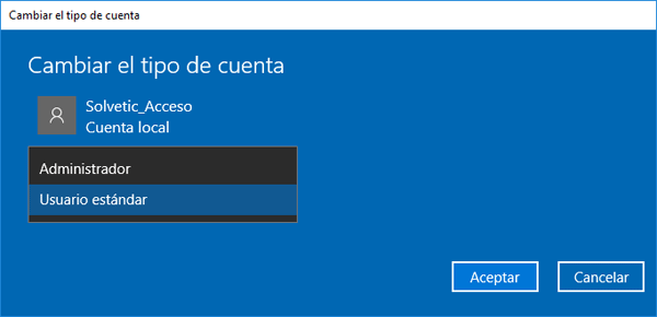 Windows 10 nos permite crear un usuario local de forma sencilla pero esta cuenta estará con los privilegios de una cuenta estándar hasta el momento en que decidamos cambiar el tipo de cuenta. Recordemos que una cuenta permite el acceso al sistema, pero no le otorga al usuario privilegios para modificar parámetros o valores dentro del sistema como edición de políticas, instalar nuevo software, etc.