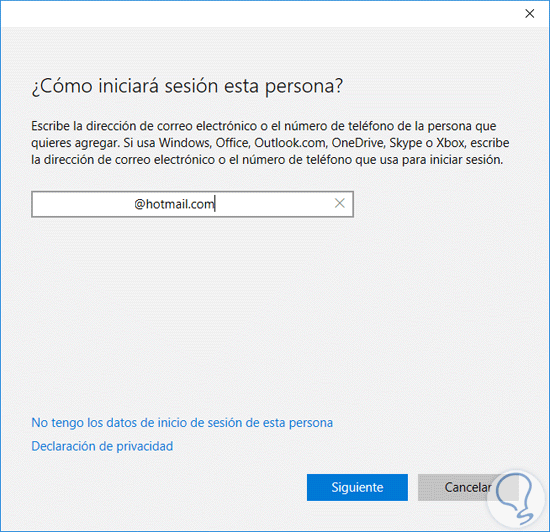 Accedemos nuevamente a la opción Agregar persona a este equipo y en la ventana desplegada ingresamos la dirección de correo electrónico del usuario, Hotmail u Outlook: