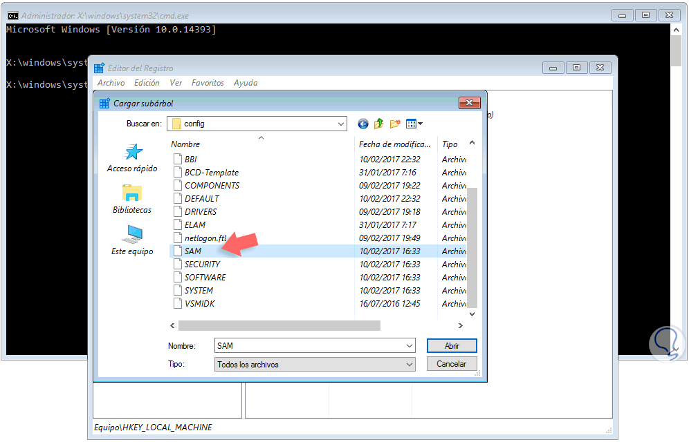 En la ventana desplegada vamos a la ruta D:\Windows\System32\config y allí seleccionamos el archivo SAM y pulsamos en la opción Abrir.