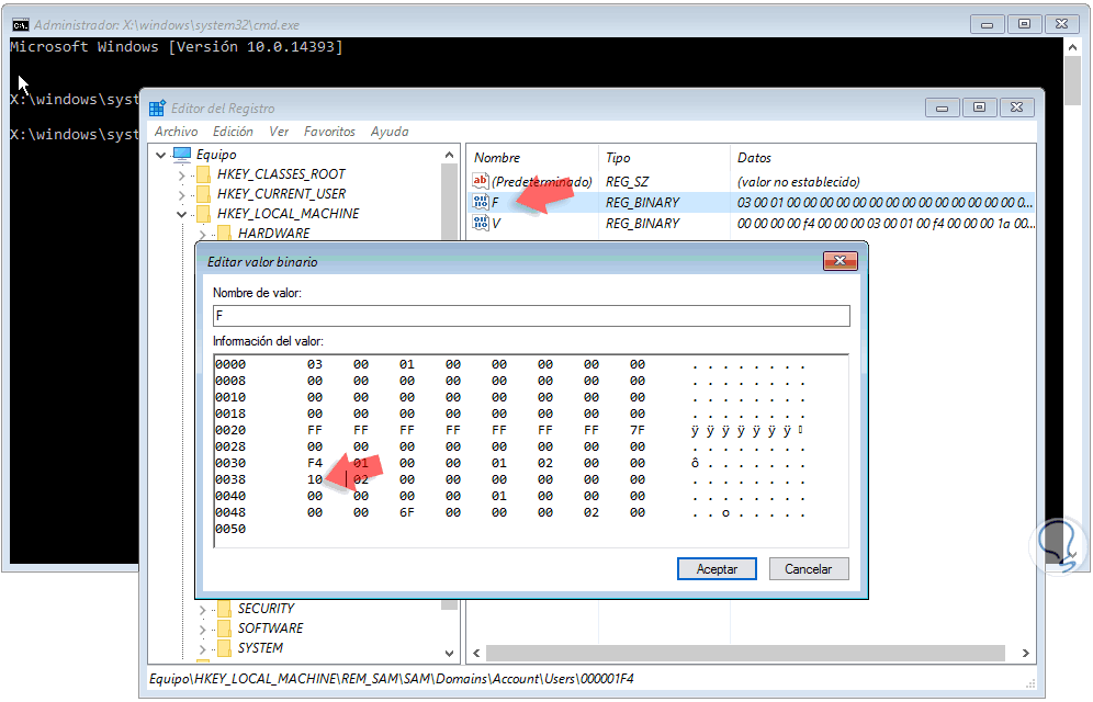 Daremos doble clic sobre el registro F en el costado derecho y para activar el usuario Administrador usando este método modificamos el primer valor de la línea 0038 de 11 a 10. Pulsamos en Aceptar para guardar los cambios.