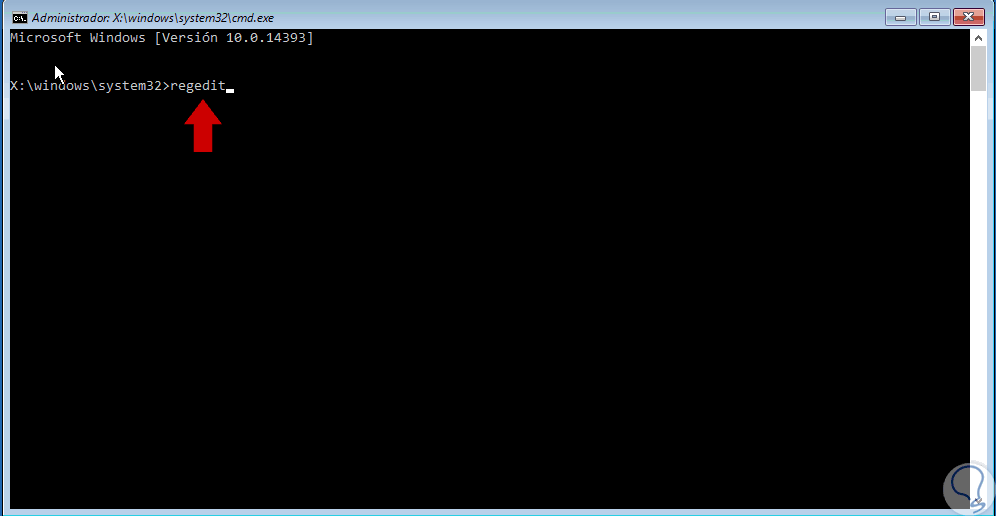Allí seleccionamos la opción Símbolo del sistema y cuando tengamos la consola del símbolo del sistema abierta ingresaremos el comando regedit para acceder al editor de registros: