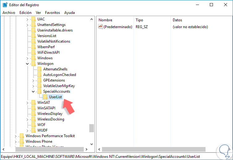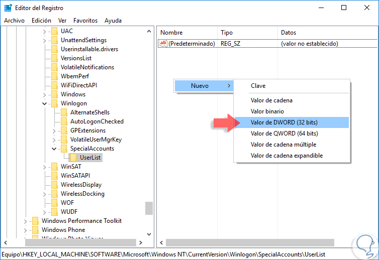 Una vez estemos en UserList daremos clic derecho en cualquier espacio en blanco y seleccionamos la opción Nuevo / Valor de DWORD (32 bits).