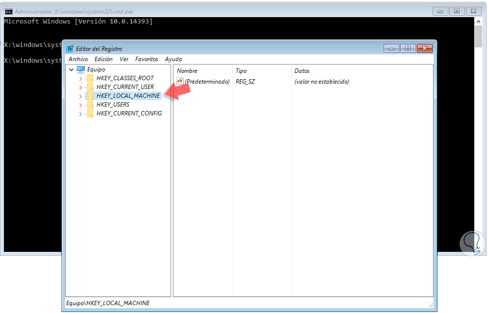 Pulsamos Enter, en la ventana desplegada seleccionamos la línea HKEY_LOCAL_MACHINE.