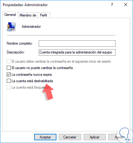 Para habilitar el usuario administrador daremos doble clic sobre él y en la ventana desplegada desactivamos la casilla La cuenta esta deshabilitada. Pulsamos en Aplicar / Aceptar para guardar los cambios.