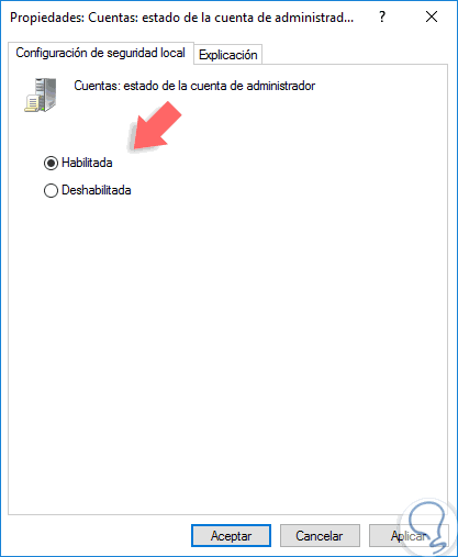Damos doble clic sobre dicha política y para activar el usuario administrador activamos la casilla Habilitada. Pulsamos en Aplicar y luego en Aceptar para guardar los cambios.