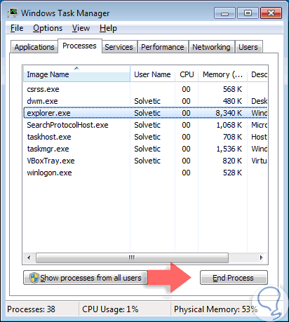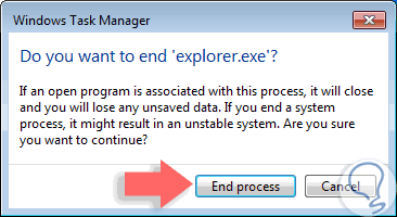 En Sistemas Operativos Windows 7 accedemos al administrador de tareas, ubicamos el proceso explorer.exe y allí debemos pulsar en la opción End Process o Finalizar Proceso ubicada en la parte inferior. Windows 7 no nos ofrece la posibilidad de reiniciar el proceso.