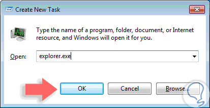 Ahora debemos ir al menú File – Archivo y seleccionar New Task – Nueva Tarea e ingresar el comando explorer.exe. Pulsamos en OK para iniciar el proceso.