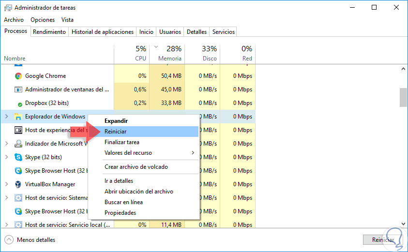 Como en todo sistema estos procesos pueden verse involucrados en fallos de rendimiento o de ejecución y la forma más práctica para solucionar esto es reiniciando, no el equipo, sino el proceso del explorador de Windows.