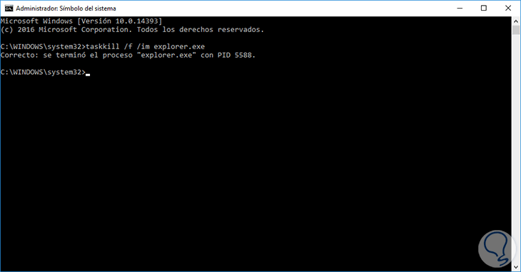 Se desplegará una consola en la que tenemos que ingresar el siguiente comando para reiniciar el proceso del explorador de archivos: