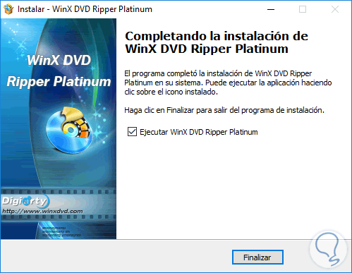 El proceso de instalación es muy sencillo, basta con ejecutar el archivo descargado y seguir los pasos del asistente. Una vez finalizado el proceso de instalación podremos ejecutar de manera inmediata la aplicación activando la casilla Ejecutar WinX DVD Ripper Platinum